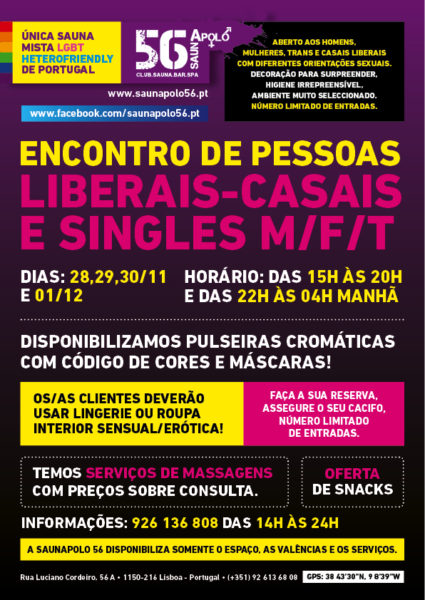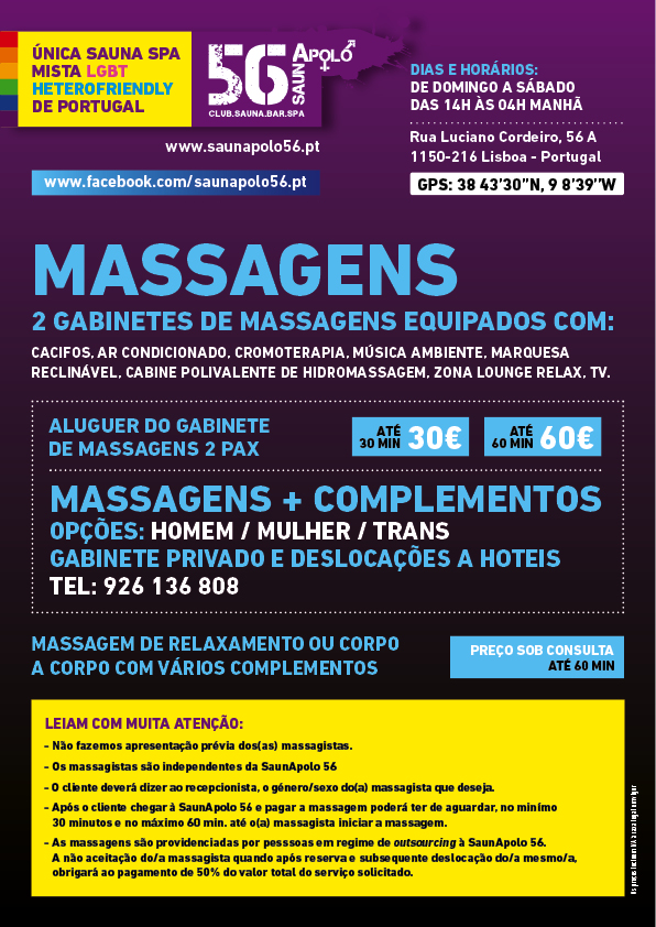 A SaunApolo56 está aberta todos os dias das 14h00 às 4h00, inclusivé aos fins de semana e feriados.